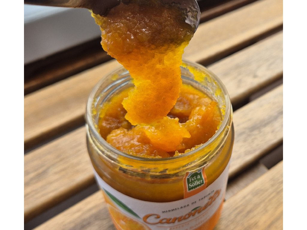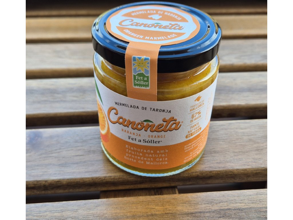 Marmeláda Canoneta z údolí Sóller je neodolatelná lahůdka, která potěší i ty nejnáročnější jazýčky. Již víme, že údolí Sóller je proslulé svým středomořským klimatem, ideálním pro pěstování sladkých, šťavnatých pomerančů. Tato ručně vyrobená marmeláda zachycuje podstatu čerstvě sklizených pomerančů a kombinuje jejich zářivou chuť s omamnou vůní. Každá lžička této lahodné marmelády je explozí čerstvých citrusů a přírodní sladkosti a lehkou hořkostí šlupky. Tradiční výrobní proces zajišťuje zachování chuti a kvality pomerančů. Nejlepší ovoce je pečlivě vybíráno, nakrájeno na tenké plátky a dušeno s trochou cukru, čímž vzniká hedvábně hladká textura.